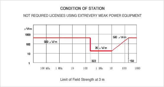 • 법적 전계강도 기준으로 10mW 이하의 제품이 해당되며, 해당 제품은 License를 획득하지 않아도 되나, 기술기준적합인증 또는 MIC의 검사 대상이 된다.